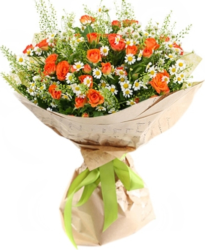 3 оранжевых кустовых розы, 1 кустовая ромашка, зелень, упаковка, лента5 оранжевых кустовых роз, 9 кустовых ромашек, зелень, упаковка, лента9 оранжевых кустовых роз, 15 кустовых ромашек, зелень, упаковка, лента